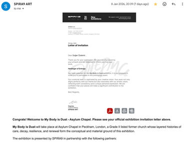 "My Body is Dust" is an international site-responsive exhibition curated by SPIRA9, staged within the atmospheric and historically layered interior of the Asylum Chapel - a Grade II listed landmark in Peckham, London.